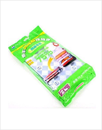 真空压缩袋,主要用于棉被、衣服的储藏,将衣服和棉被放入真空袋后,用滑片密封袋口,然后用吸尘器或抽气管抽气,或者,直接用手卷压方式排除空气,从而衣